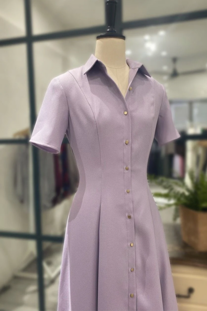 The Purple Bijou Midi Dress is crafted from a premium soft fabric in a sophisticated and trendy light purple hue. The minimalist A-line design maintains the elegance of a classic shirt collar while the skirt flows gracefully. The dress is accentuated with a row of delicate buttons. It is fully lined for a smooth finish.