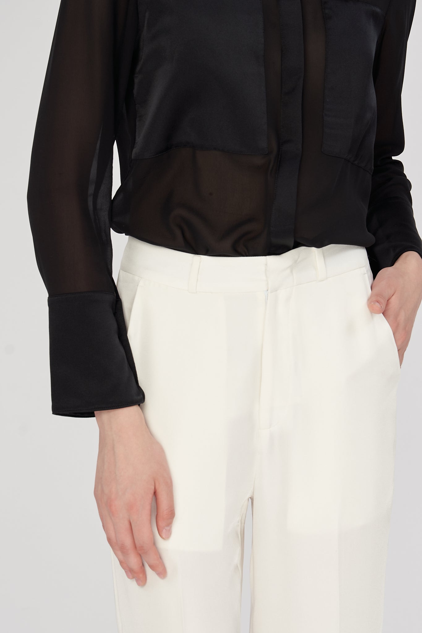 Elevate your workwear with a touch of luxury - our classic ivory trousers made of 3 layers of Twill silk. These pants are a smart and sophisticated addition to your everyday wardrobe, exuding elegance and style. With a retro-inspired fit, they offer a unique and timeless look that perfectly complements any formal setting. Beyond the office, these versatile trousers can be effortlessly styled for casual occasions, making them a must-have staple in your closet. Embrace the comfort and refinement of Twill silk, and elevate your style with these chic and versatile black trousers, ensuring you always make a polished and confident statement
