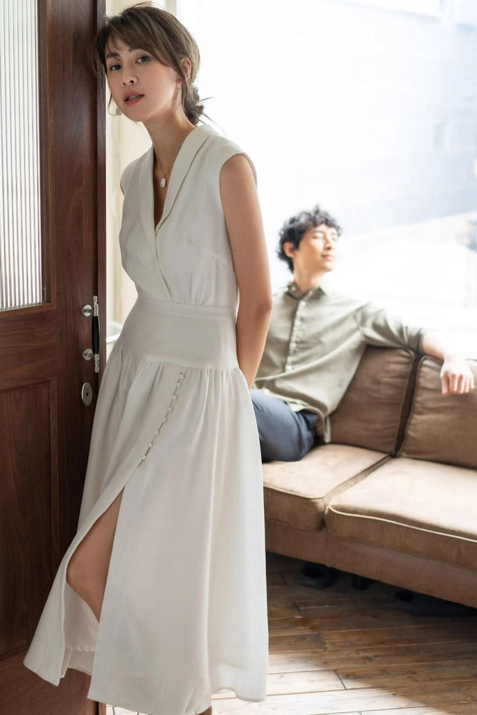 - The charming wrap-over neckline design adds a touch of femininity and sophistication, while the elegant high-slit skirt with delicate button detailing creates a captivating silhouette.